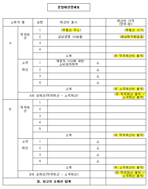 즉, 엄격한 요건하에서만 재산분할청구권의 사전 포기가 인정되며 이 경우 위 분할재산명세표와 같이 부부 사이에 재산분할의 대상이 되는 재산에 대한 구체적 협의가 전제되어야 하는바 재산분할 포기약정은 신중히 접근하여야 합니다. 저희 사무실에서는 이와 관련하여 자세한 상담을 해드리고 있으니 언제라도 연락주시면 성실히 상담하여 드리겠습니다.