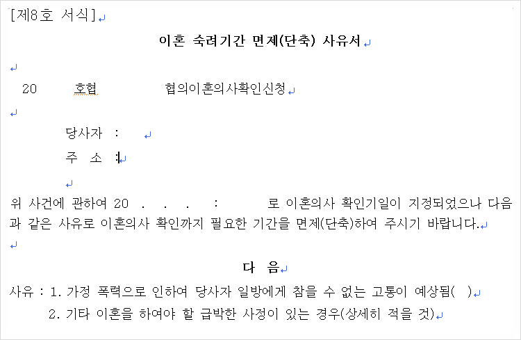 그런데 상대방이 이혼은 동의하지만, 폭행이나 협박을 하는 경우가 있어 숙려기간을 기다릴 수 없는 경우 그 기간을 단축해달라고 신청할 수 있습니다.