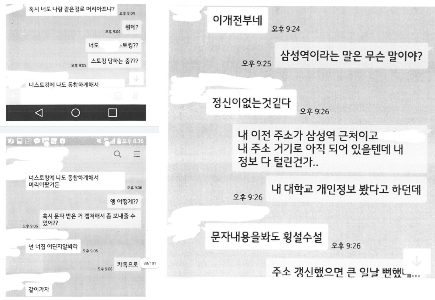 친구가 스토커에게 시달리다가 저에게 잘 지내냐는 안부카톡이 왔을 때도 창피해서 스토킹에 시달린다는 사실을 밝히지 못했는데 고소를 준비하면서 친구가 시달리다가 안부카톡을 보낸 것이었다는 것을 알게 되었습니다.