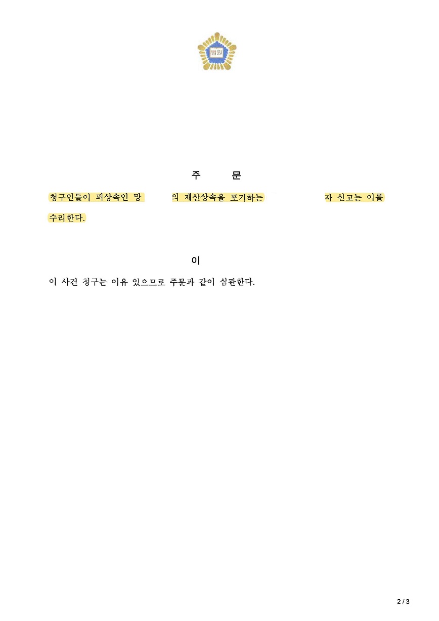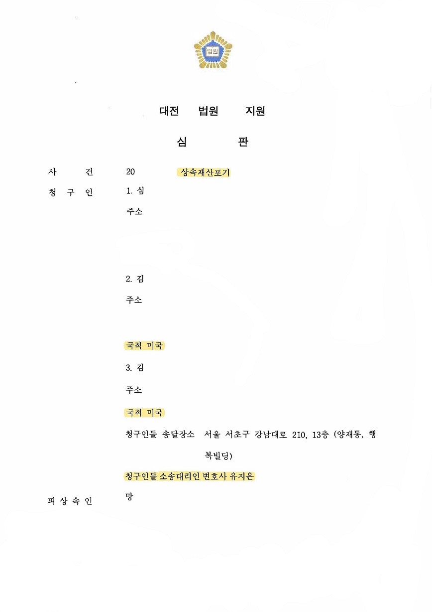 한편 코로나로 인하여 영사관 예약 잡는 것이 어려워 필요한 서류들을 받는 데까지 약 2달 정도 소요되었으나, 기한 내 상속포기 심판청구서를 접수한 후 위와 같은 사정을 재판부에 소명하였고, 결국 필요한 서류들을 보정하여 상속포기가 잘 마무리되었습니다.