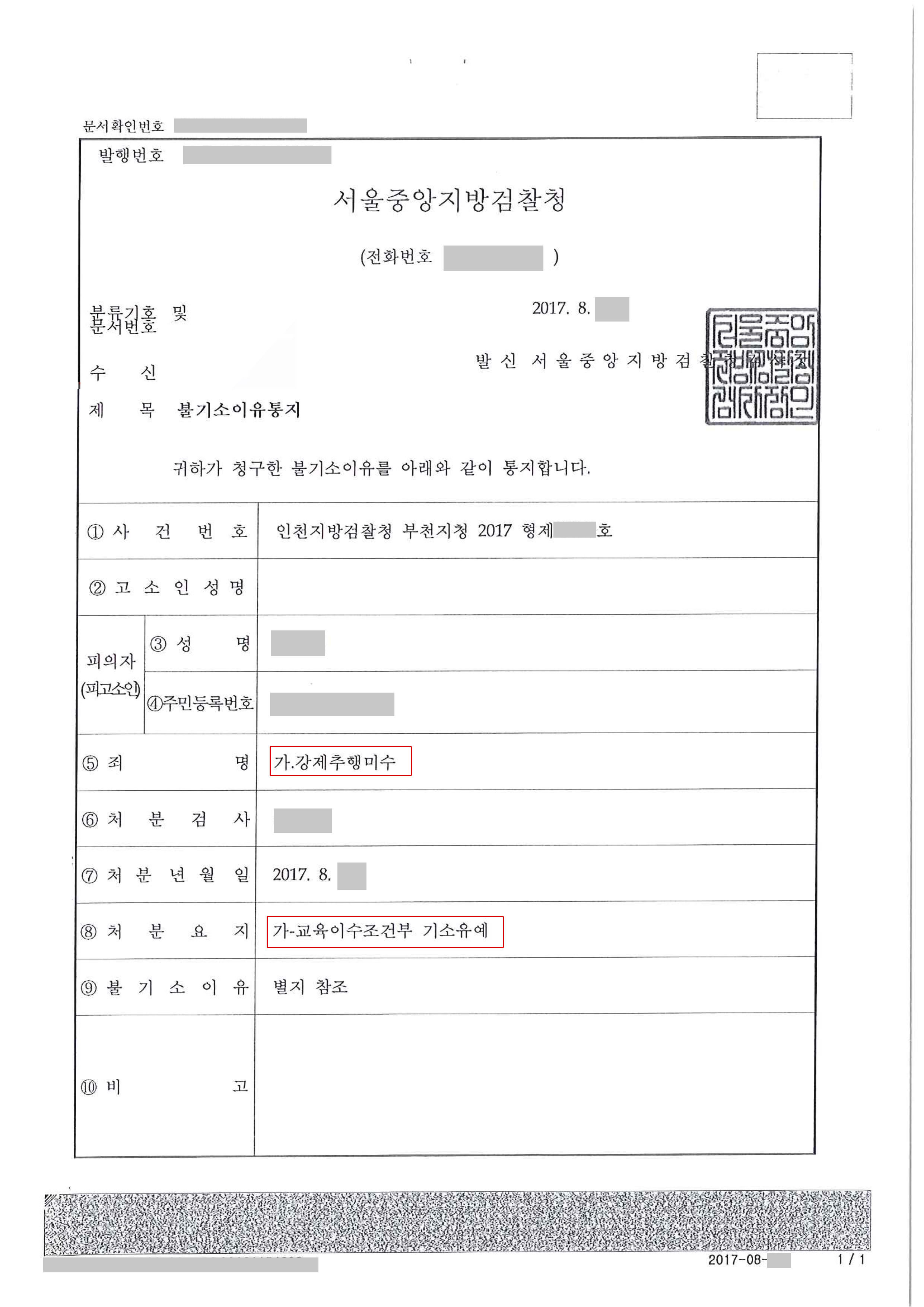 의뢰인은 혐의의 즉각적 인정과 반성의 태도를 담은 진술서를 검찰에 제출하였고 이에 검찰은 처벌의 필요성이 적다는 이유로 피의자에게 교육이수조건부 기소유예 처분을 내렸습니다.