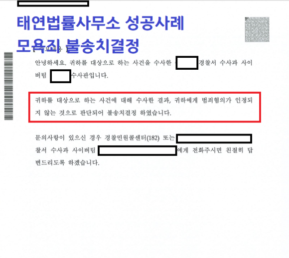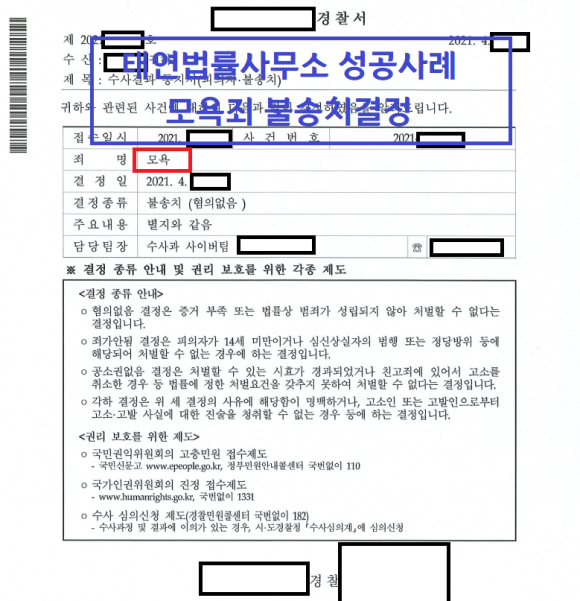 그리고 최근 모욕죄 불송치결정 의견을 수령하였습니다.