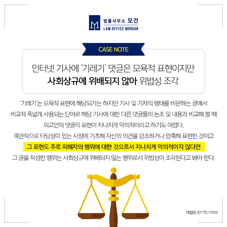 이에 재판부는 비록 꽃뱀이라는 용어는 사회적 평가를 저하시킬만한 경멸적인 표현에 해당되지만, A씨의 댓글은 고소인 개인에 대한 경멸적 표현에 초점이 맞추어진 것이 아니라, 극단적인 주장을 하는 사람들에 대한 비난에 중심을 두고 있는 점을 고려하면, A씨가 고소인의 사건을 둘러싼 논쟁에서 자신의 의견을 개진하는 과정에서 일부 부적절한 표현을 사용하게 된 것으로, 표현의 맥락과 수위에 비추어 볼 때 사회상규에 위배되지 않는다고 보고 무죄를 선고하였습니다(수원지법 평택지원 2019고단1XXX).