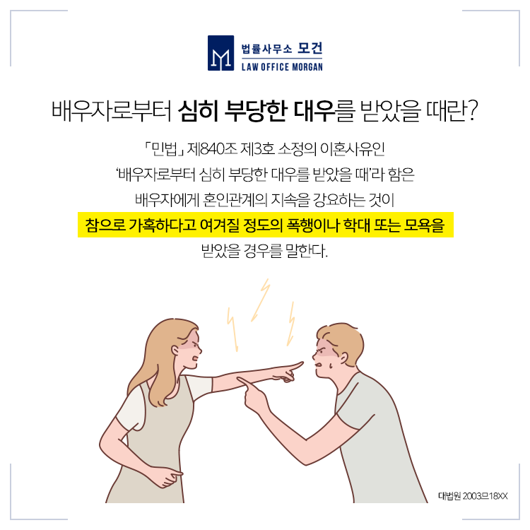 「민법」에서 정한 6가지 이혼사유 중 폭언 등에 의한 이혼은 제3호인 '배우자로부터 심히 부당한 대우를 받았을 경우'와 제6호인 '기타 혼인을 계속하기 어려운 중대한 사유가 있을 경우'에 해당될 수 있는데요. 다만, 이를 인정받기 위해서는 두 사람의 부부관계가 회복할 수 없을 정도로 파탄되었다고 인정되어야 하므로 상대방으로 부터 지속적인 언어폭력의 증거를 바탕으로 충분한 이혼사유를 갖춘 소송을 준비해야 이혼 및 위자료청구에 유리할 수 있습니다.