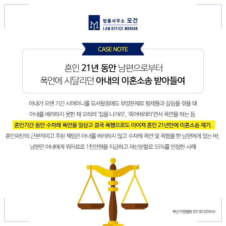 결국 재판부는 두 사람의 혼인관계는 더이상 회복할 수 없을 정도로 파탄되었다고 인정하고, '두 사람은 이혼하고, B씨는 A씨에게 위자료로 1천만원을, 재산분할로 1억 6,000만원(45% 인정)을 지급하라'고 판결하였습니다(부산가정법원 2017드단20XXXX).