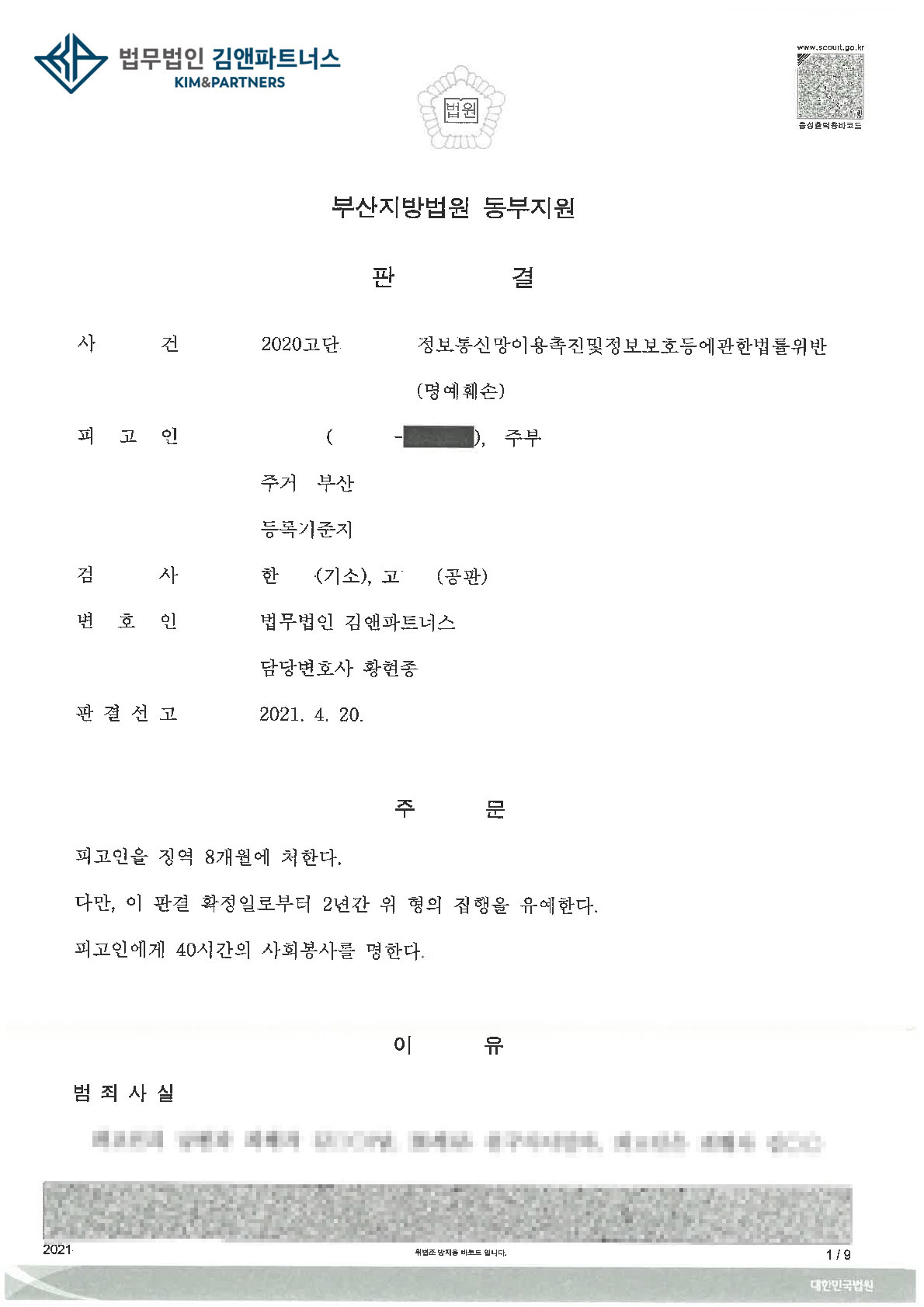 황변호사는 최근 정보통신망 이용촉진 및 정보호보 등에 관한 법률(이하 '정보통신망법')상 명예훼손으로 기소된 의뢰인을 변호하여 집행유예 판결을 받았습니다.