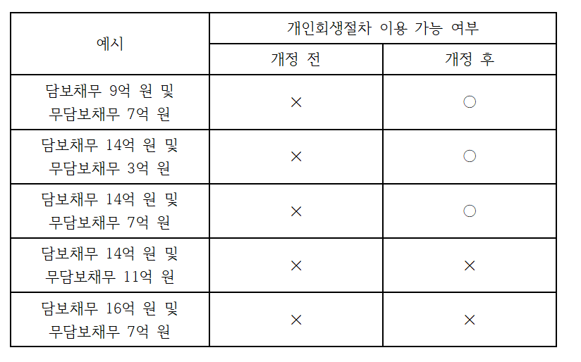 이러한 부분에 대한 문제의식이 어느 정도 공감대가 있었고, 최근 국회법제사법위원회에서 채무자 회생법 개정안에 대한 검토와 통과가 있었고, 이에 대하여 정부에서 2021. 4. 21. 에 개정법률을 공포하고 바로 시행에 들어가게 되었습니다. 이에 따라 2021. 4. 20. 이후에는 무담보 채무 10억원, 담보 채무 15억원이 개인회생 신청 범위로 수정됨에 따라, 상당수의 채무자가 간이회생이 아닌 개인회생절차를 이용할 수 있게 되었습니다. 채무액 범위와 비용 문제로 고민하였던 분들은 자신의 채무 상황을 확인해 보고 적극 활용할 필요가 있습니다. 관심있는 분들이 많이 활용하시면 좋겠습니다. 아래 표는 회생법원에 공지사항란에 게시된 내용 중 일부입니다. 참고하시기 바랍니다.