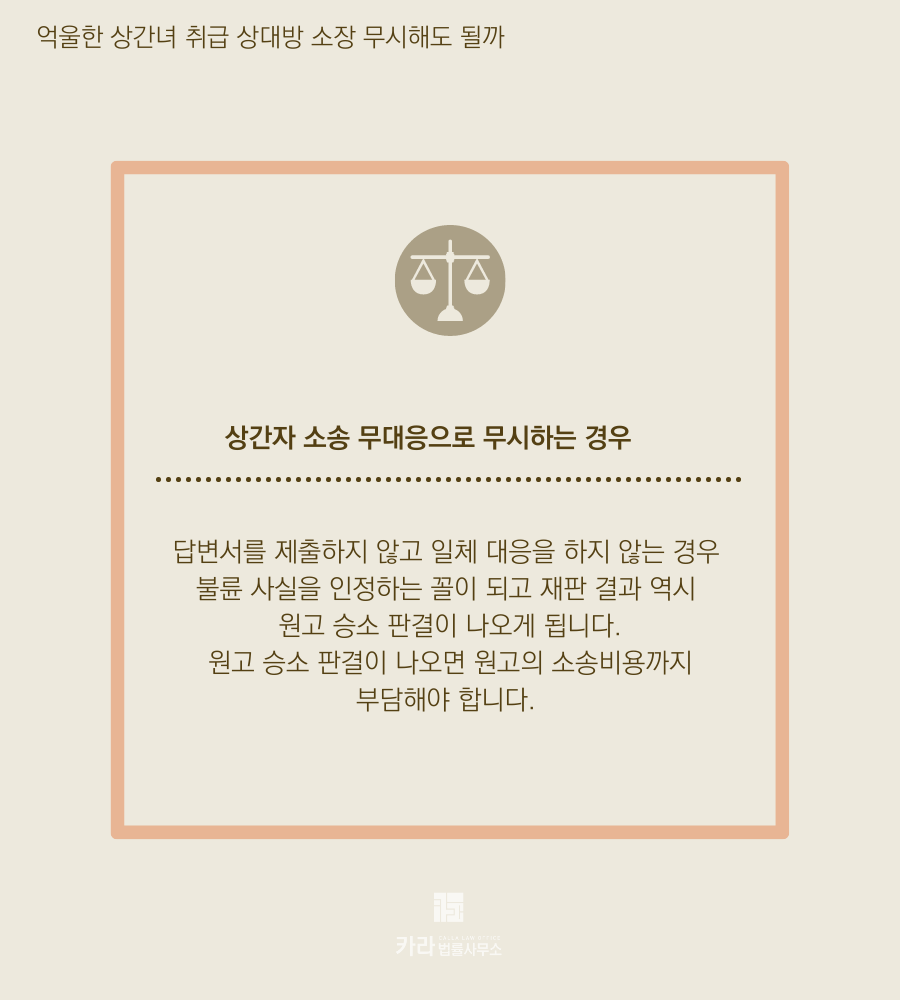 실제로 불륜녀로 소송을 당했다면 당연히 소송에 대응하기 위해 변호사를 찾게 되겠지만, 사실도 아닌데 괜한 오해로 자신과 전혀 관계가 없는 법정 시비에 휘말렸다고 생각한다면 대부분 내 일이 아니라고 생각해 소장을 무시하고 대응을 하지 않는 경우가 있습니다.