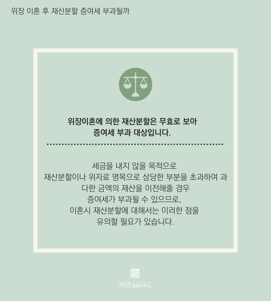 이혼을 하였다고 하더라도 그 이혼이 위장이혼에 해당해 무효라면 재산분할 명목으로 이전한 재산에 대하여 증여세 등이 부과됩니다.