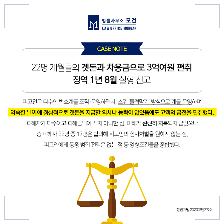 하지만 계원들이 계불입금을 제대로 하지 않아 계가 제대로 운영되지 않음에도 계주가 계원을 모집하여 곗돈을 편취하거나, 계주로써 금전적 능력이 있음을 바탕으로 금전을 대여하여 편취한 경우 등 상대방에 대한 기망행위 및 편취의 범의가 인정되는 경우에는 '사기죄'로 처벌대상이 될 수 있습니다. 만약 곗돈사기로 계주 등을 고소하거나, 피고소인이 되신 분들이라면 신속히 관련 사건에 경험을 갖춘 형사전문변호사의 도움을 받으셔야 합니다.