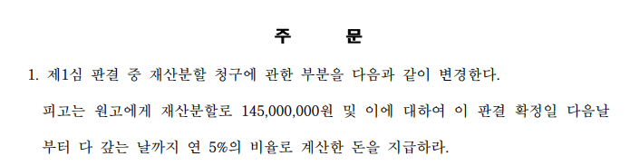 1) 제1심 판결 중 재산분할 청구에 관한 부분을 다음과 같이 변경한다. 피고는 원고에게 재산분할 145,000,000원 및 이에 대하여 이 판결 확정일 다음날 부터 다 갚는 날까지 연 5%의 비율로 계산한 돈을 지급하라.