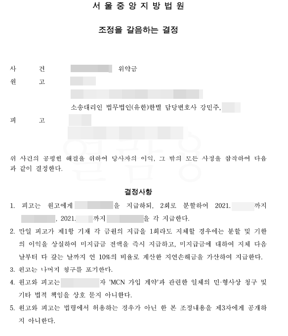 저희 측 서면과 증거를 통해 크리에이터의 잘못이 드러난 상황에서 회부된 조정이었기 때문에, 피고의 손해배상액수에 대한 논의가 진행되었고, 지급기한을 나누어 지급하는 조건으로 조정이 성립하였습니다.