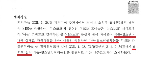 A씨는 2021. 2.초경 자신 소유의 스마트폰으로 음란물 관련 디스코드 대화방에 참여하던 중, 누군가가 '노예녀-중딩'이라는 파일명 등의 성착취물이 저장되어 있던 메가클라우드로 연결되는 링크를 유포하자, 이를 발견하고 접속하여 다운로드받아 소지한 것을 비롯하여, 총 6회에 걸쳐 성착취물을 다운로드받아 소지하였습니다.