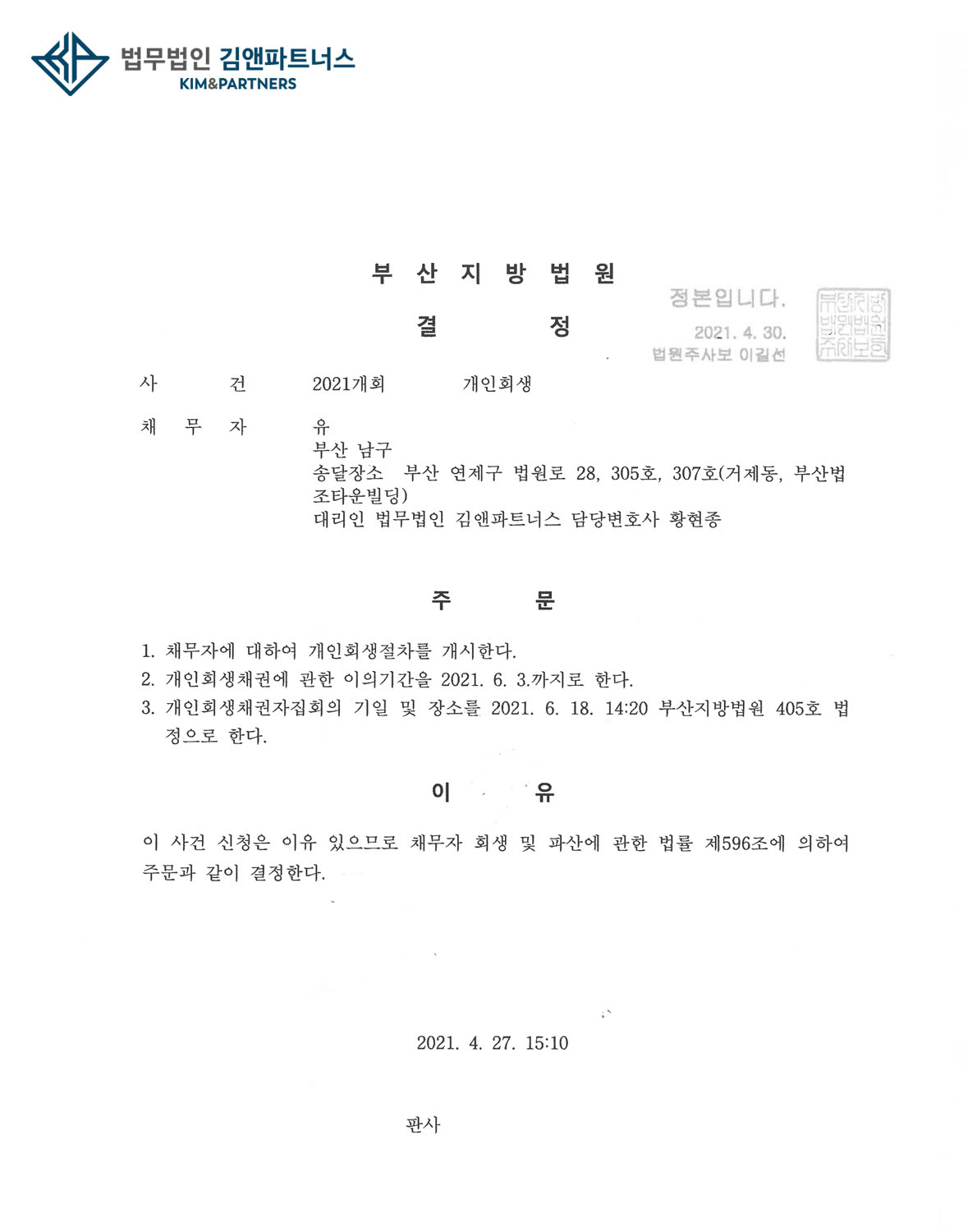 황변호사는 부산지방법원에서 의뢰인에 대핸 개인회생 개시결정을 받았습니다.