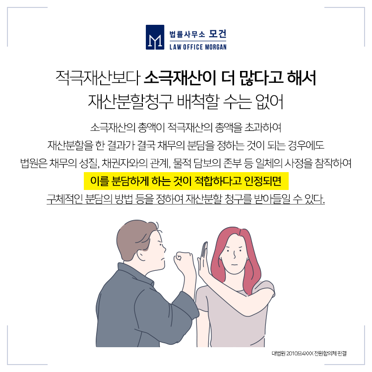특히 재산분할의 문제는 부부가 그간 공동으로 모은 재산을 나누는 것으로, 공평하게 반으로 나누는 것이 아니라 재산의 형성에 기여한 정도 등 당사자 쌍방의 일체의 사정을 참작하여 비율을 정하여 분할하기 때문에 부당한 재산분할이 인정되지 않도록 자신의 기여도를 적극 주장·입증할 수 있어야 합니다. 그런데 간혹 상대방에게 적극재산보다 소극재산인 채무(빚)가 더 많은 경우가 있습니다. 이러한 경우 재산분할은 어떻게 되는지 자세히 살펴보겠습니다.
