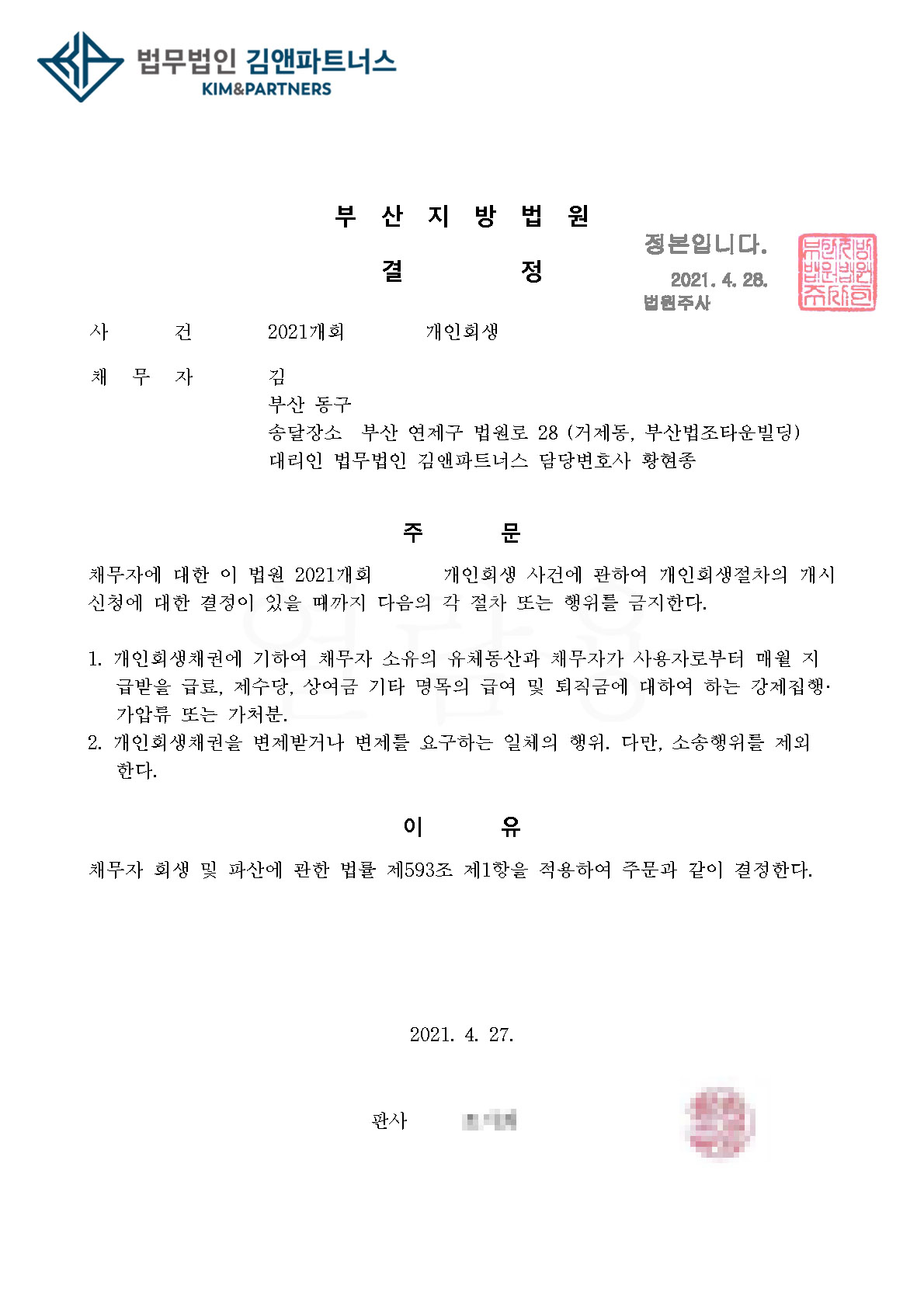 황변호사는 최근 부산지방법원에서 개인회생을 의뢰한 의뢰인에 대한 금지명령을 받았습니다.