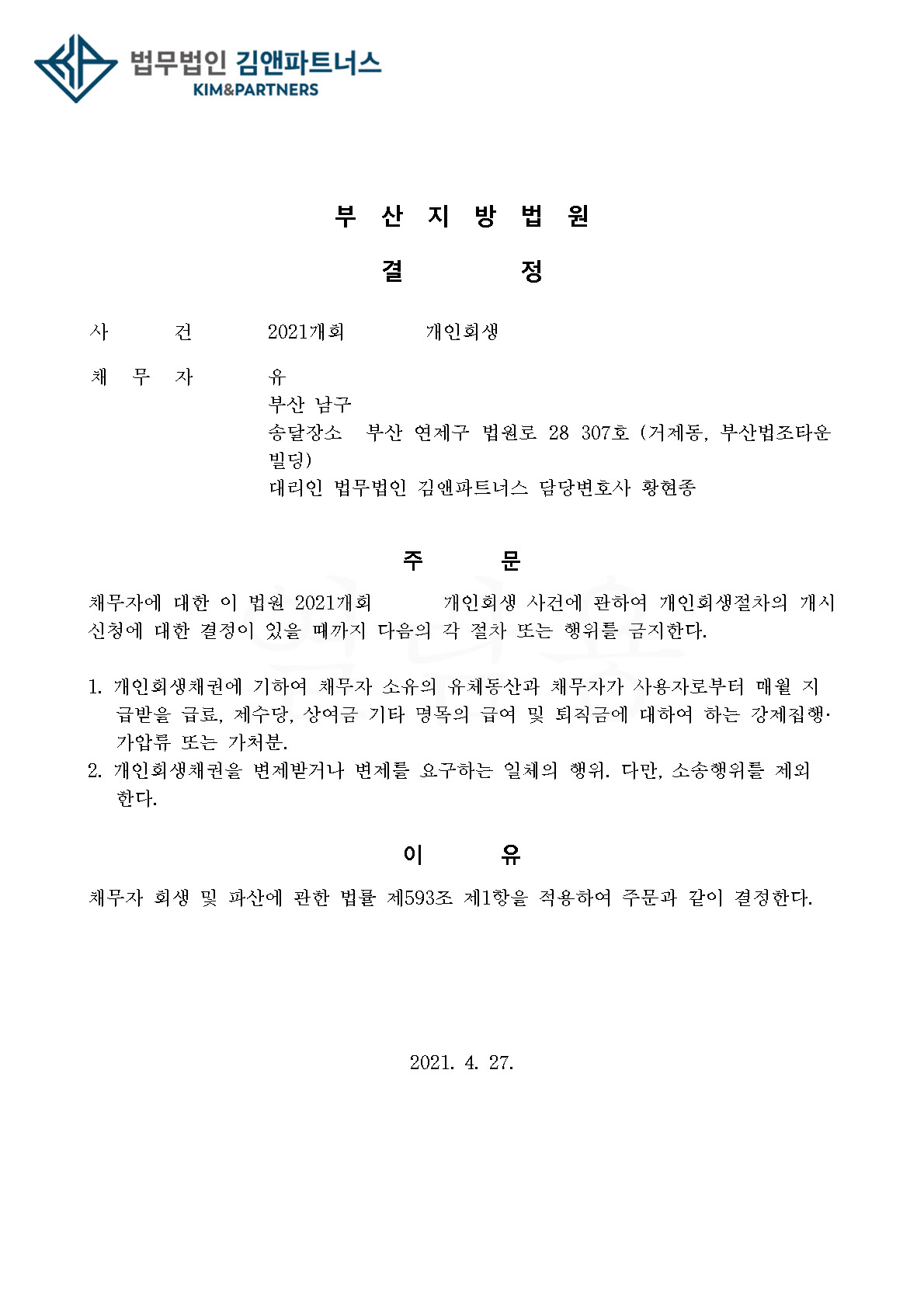 황변호사는 최근 부산지방법원에서 개인회생을 의뢰한 의뢰인에 대한 금지명령을 받았습니다.