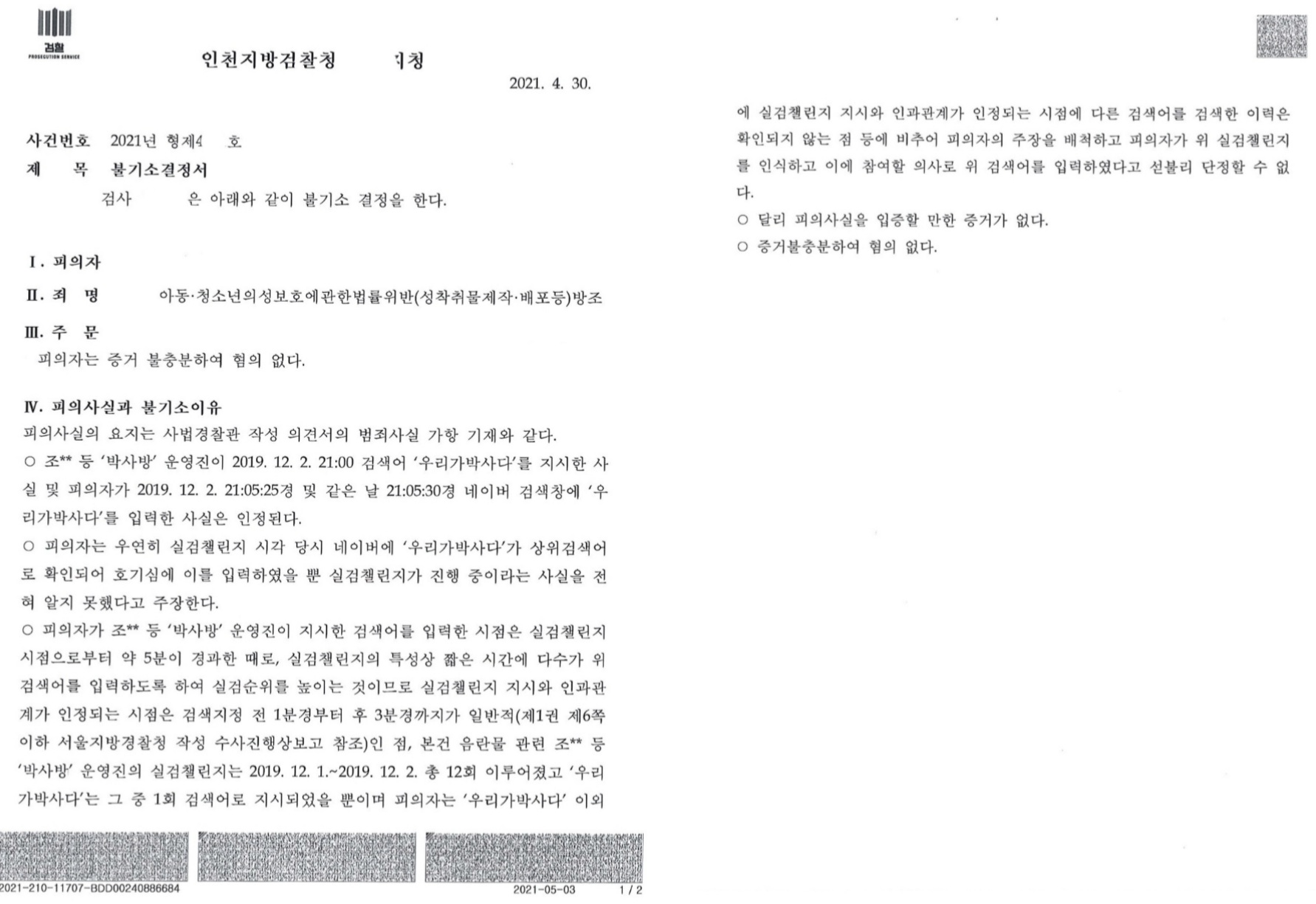 102. 무료박사방에 들어간 사실을 인정하고 아청물제작배포등 방조죄에 혐의없음 처분을 받음
