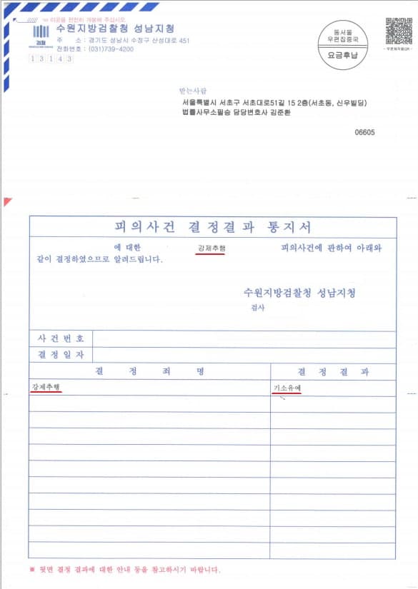 ※ 이에 수원지방검찰청 성남지청은 "기소유예" 처분을 하여 의뢰인님께서는 아무런 전과기록도 남지 않은 사건입니다.