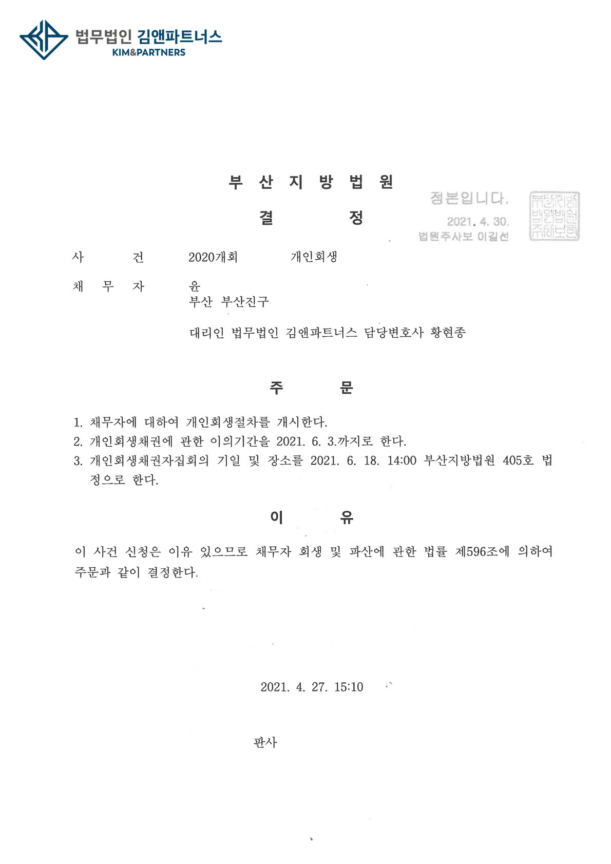 황변호사는 부산지방법원에서 의뢰인에 대핸 개인회생 개시결정을 받았습니다.