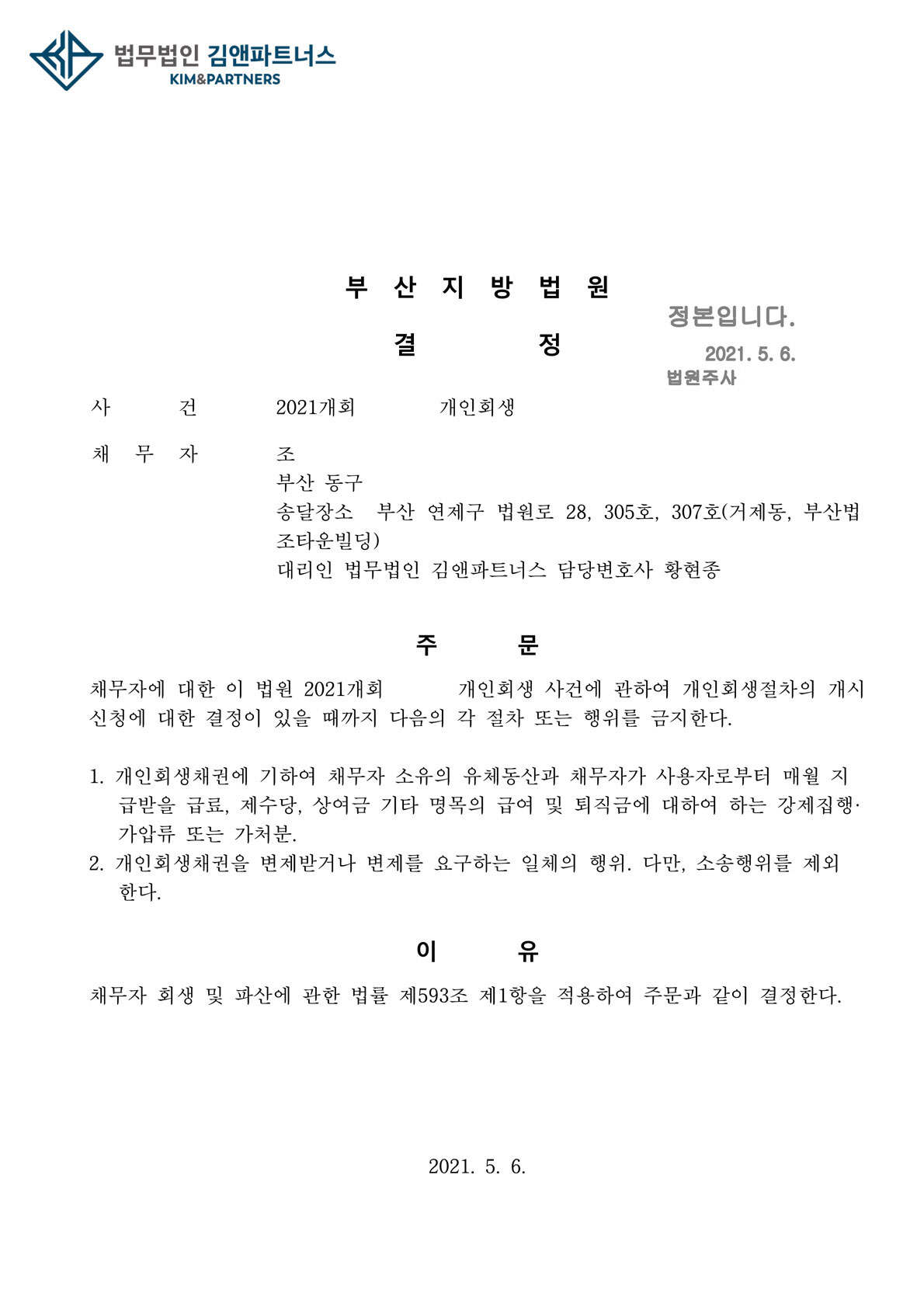 의뢰인은 금지명령을 받고 급여압류 등의 위험에서 벗어나 개인회생절차를 무사히 진행할 수 있을 것입니다.