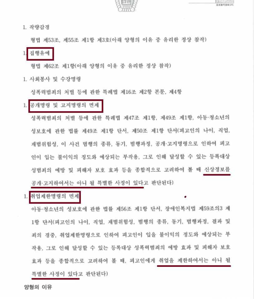 3. 결과 (집행유예 판결 및 신상정보공개 면제, 취업제한 면제)