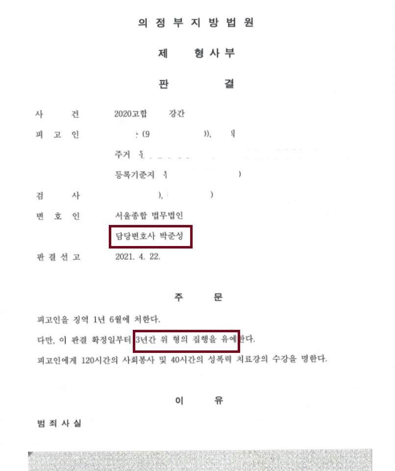 그러나 저와 의뢰인의 적극적인 노력에 따라 법원은 집행유예 판결을 선고하였고, 그 뿐만 아니라 신상정보공개 면제 및 취업제한명령면제 등으로 불이익이 될 수 있는 부수처분 등을 최소화하는데 성공할 수 있었습니다.