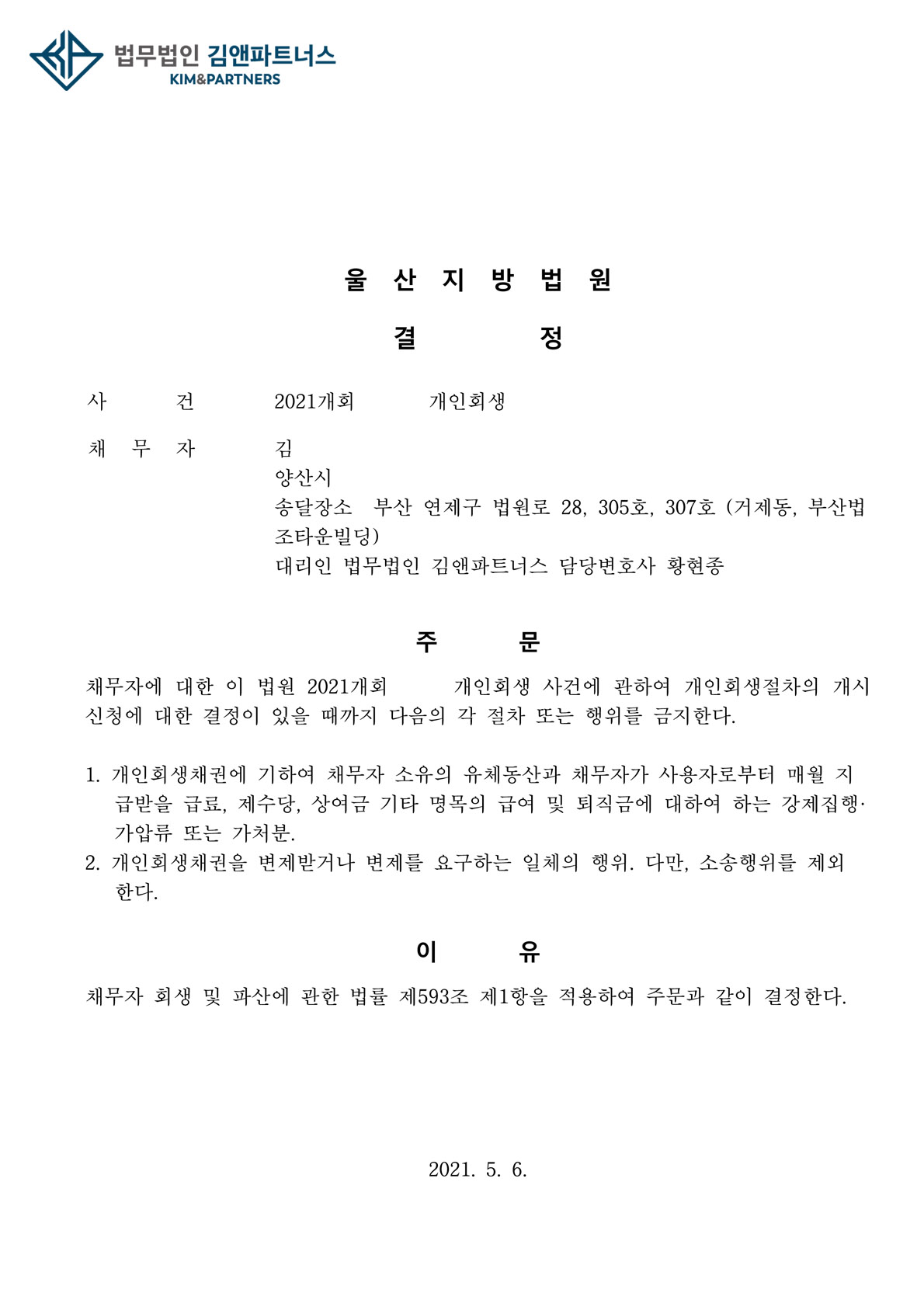 의뢰인은 금지명령을 받고 급여압류 등의 위험에서 벗어나 개인회생절차를 무사히 진행할 수 있을 것입니다.