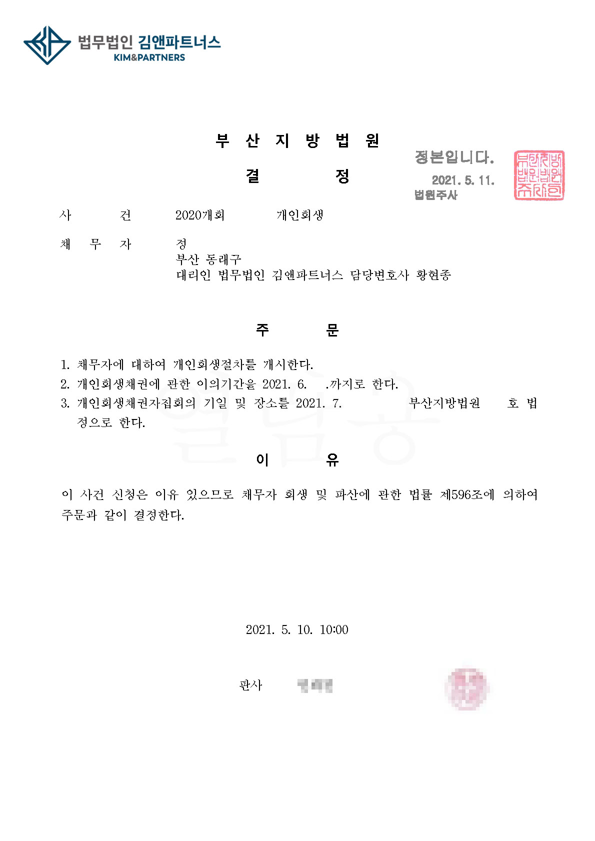 황변호사는 부산지방법원에서 의뢰인에 대한 개인회생 개시결정을 받았습니다.