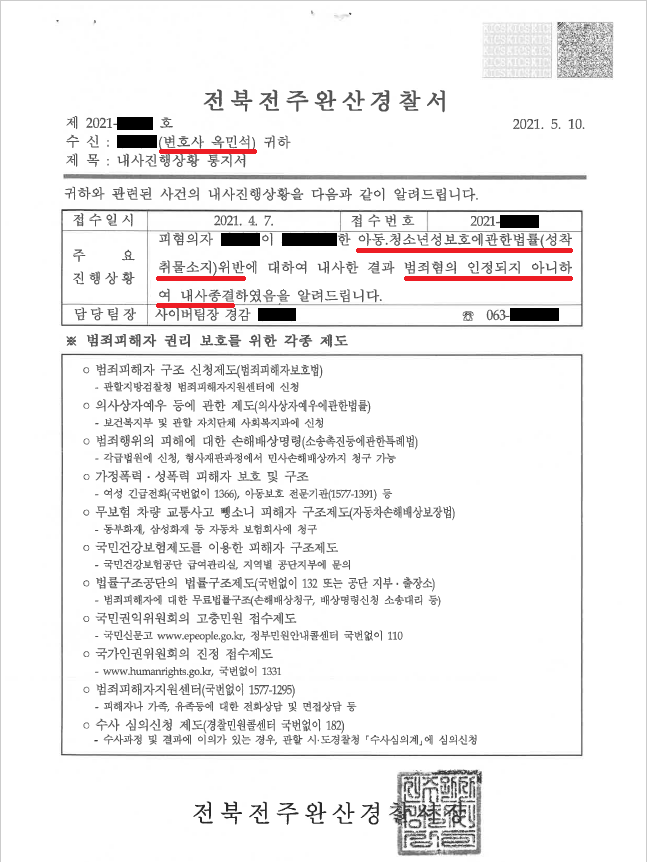 저는 수임 직후 A씨가 압수·수색 영장을 집행당하지 않고 수사를 받을 수 있도록 조치하였고, A씨에게는 성착취물소지의 고의가 전혀 없었다는 방향으로 사건을 진행하였습니다. 그 결과 A씨는 '내사종결' 결정을 받음으로써 일생일대의 위기 상황에서 빠르게 벗어날 수 있었습니다.