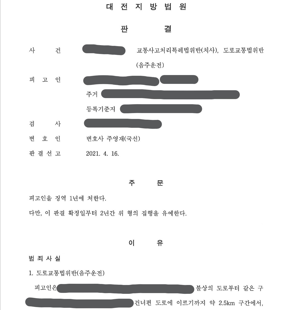 최근 주영재 변호사가 교통사처리특례법위반(치사) 및 도로교통법위반(음주운전) 사건에서 집행유예를 받은 사례가 있어 소개해드리겠습니다.