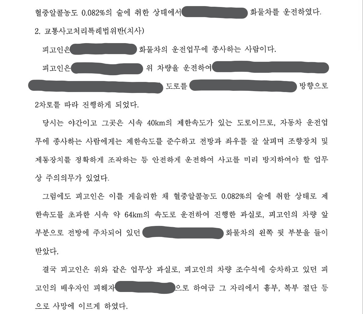 이후 저녁 8시 경 피고인은 아내를 태우고 차를 운전하여 귀가하기 시작했는데, 과속 및 전방 주시의무를 게을리 하여 불법주차 된 트럭의 후면을 충격하는 교통사고를 냈고, 이 사고로 아내가 현장에서 즉사했습니다.