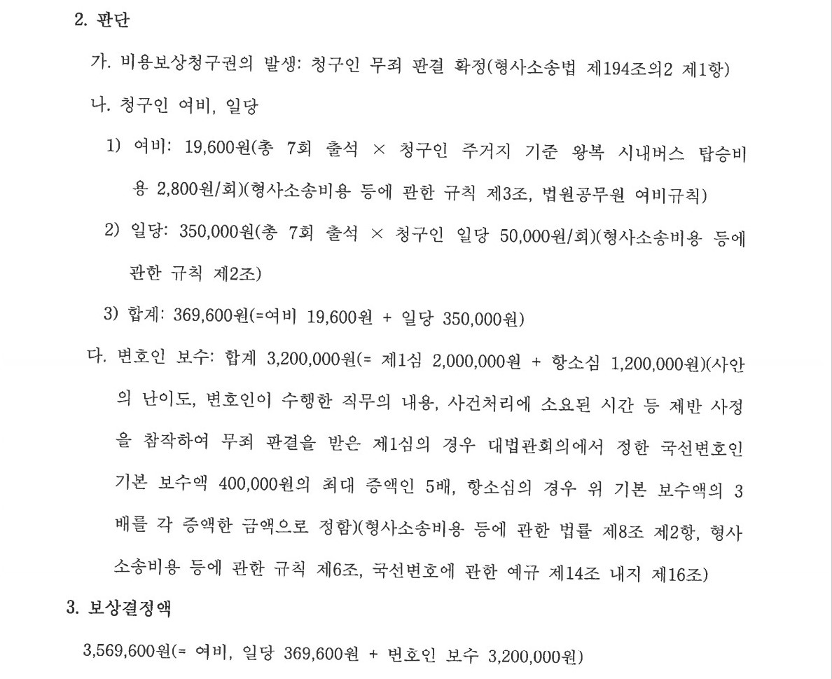 결국 의뢰인은 여비, 일당, 변호인 보수 합하여 총 3,569,600원을 보상받았습니다.