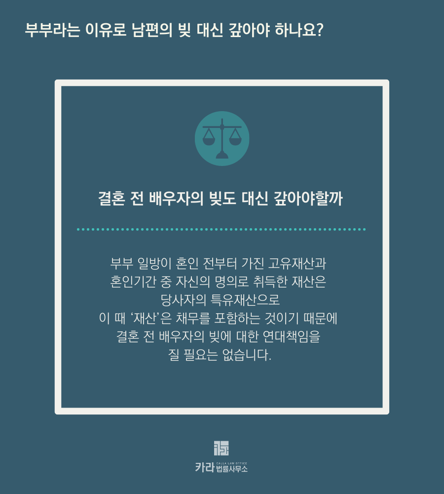 그렇다면 결혼 전 배우자의 빚은 부부라는 이유로 갚아야 하는 걸까요? 또는 이혼했는데 전남편의 빚을 갚으라는 채권추심업체의 독촉을 받는다면 어떻게 해야할까요?
