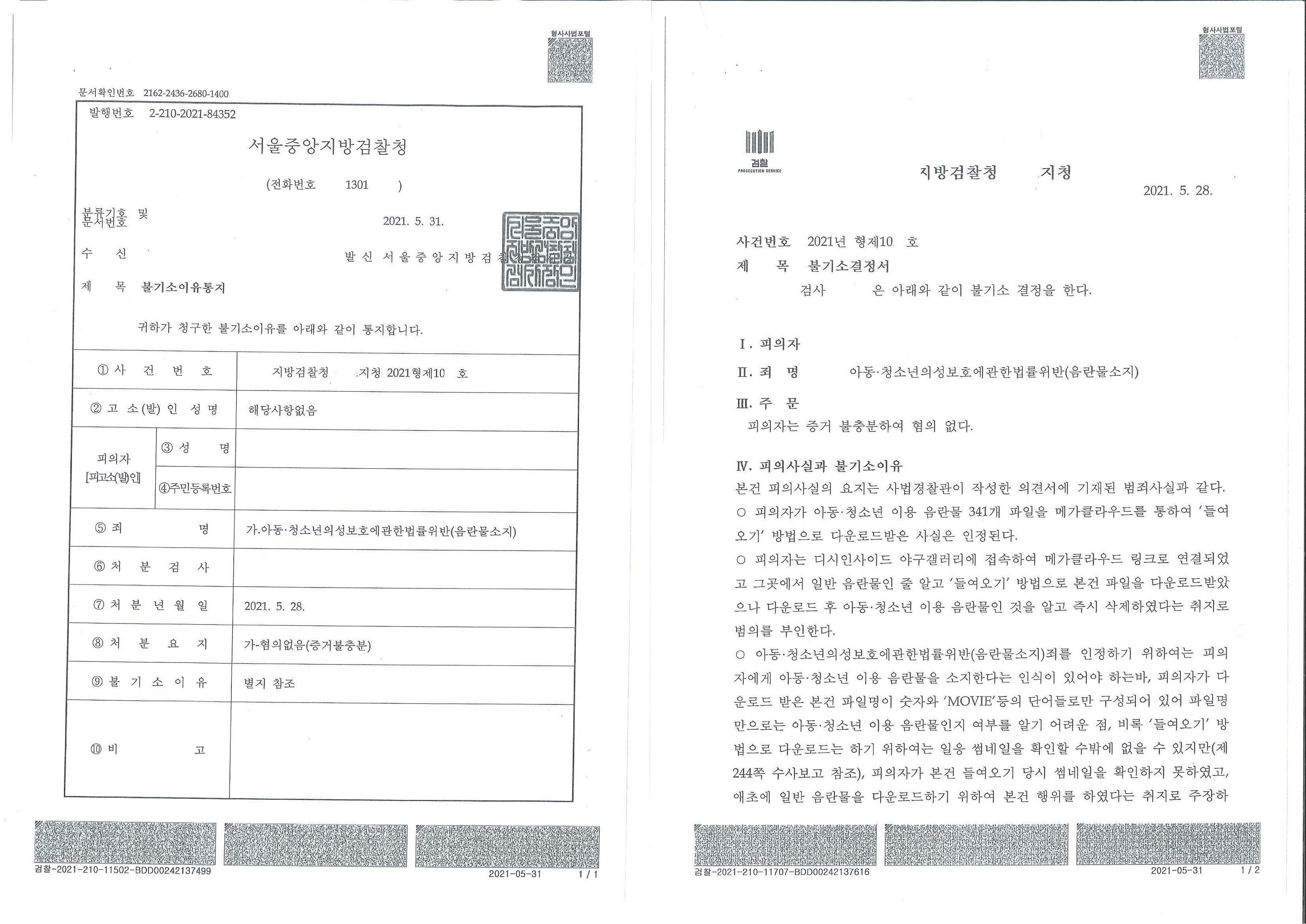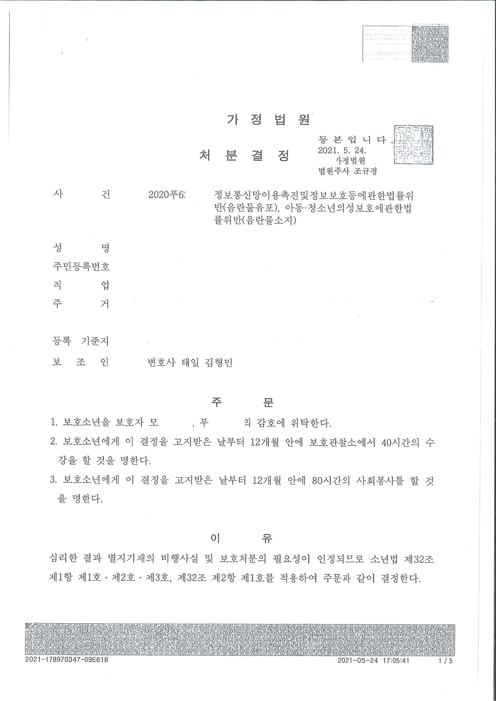 이 사건은 변호에 들인 시간도 많았고 들인 노력 또한 다른 사건의 몇 배는 되었던 것 같습니다. 성착취물소지죄에서 죄질이 더 나쁘게 평가받을 수 있는 단순 취득이 아닌 금전구매 사안이었으며 음란물유포의 점도 있었으나 결과적으로는 소년부송치되어 무사히 마무리 되었습니다. 이 과정에서는 담당 검사님에게도 수차례 의견을 제시하는 등 우여곡절이 있었습니다. 최종 결정에 있어서도 통상적으로 선고되는 1년의 보호관찰까지 피하여 너무나도 성공적인 결과라 생각됩니다.