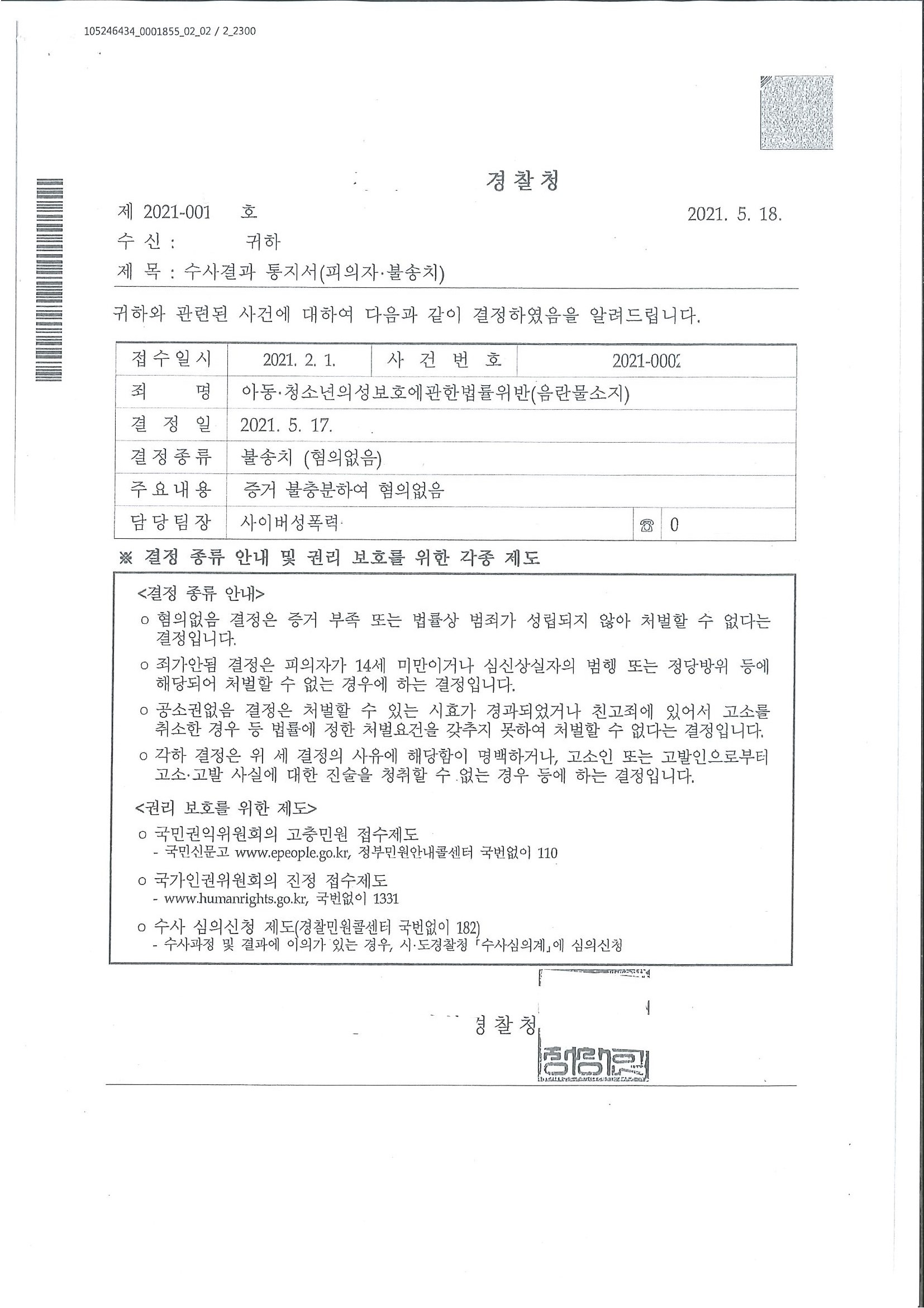 ※ 불송치결정 3건을 받았으나 사진파일 제한으로 1건만 올렸습니다. 3건 모두 보려면 네이버 김형민 변호사로 검색해서 나오는 블로그에서 보면 됩니다.