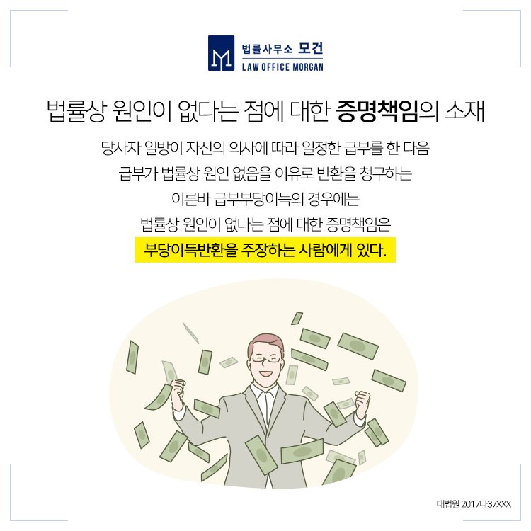 위와 같은 급부부당이득에 있어 법률상 원인이 없다는 점에 대한 증명책임은 부당이득반환을 주장하는 사람인 원고에게 있습니다. 즉, 원고는 급부행위의 원인이 된 사실의 존재와 함께 그 사유가 무효, 취소, 해제 등으로 소멸돼 법률상 원인이 없게 되었다거나, 급부행위의 원인이 될 만한 사유가 처음부터 존재하지 않았음을 주장·증명해야 합니다.