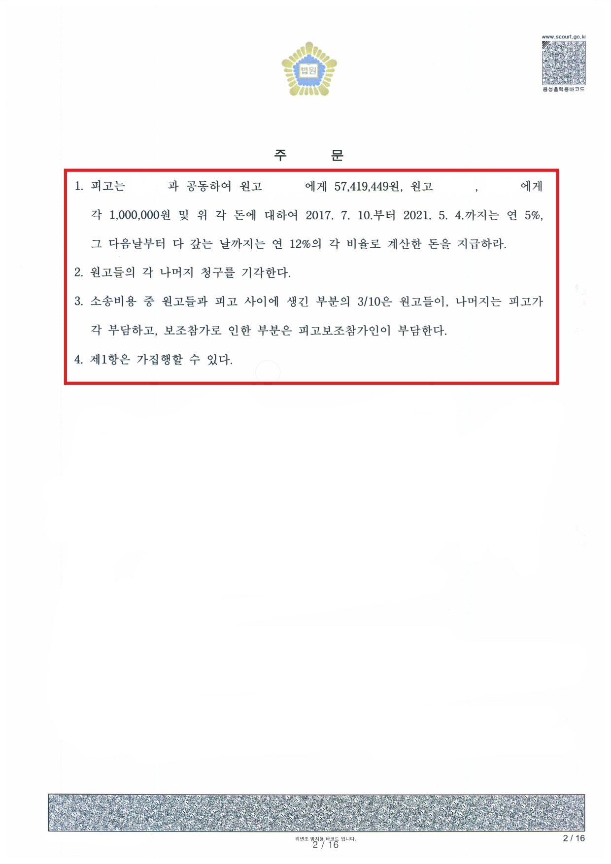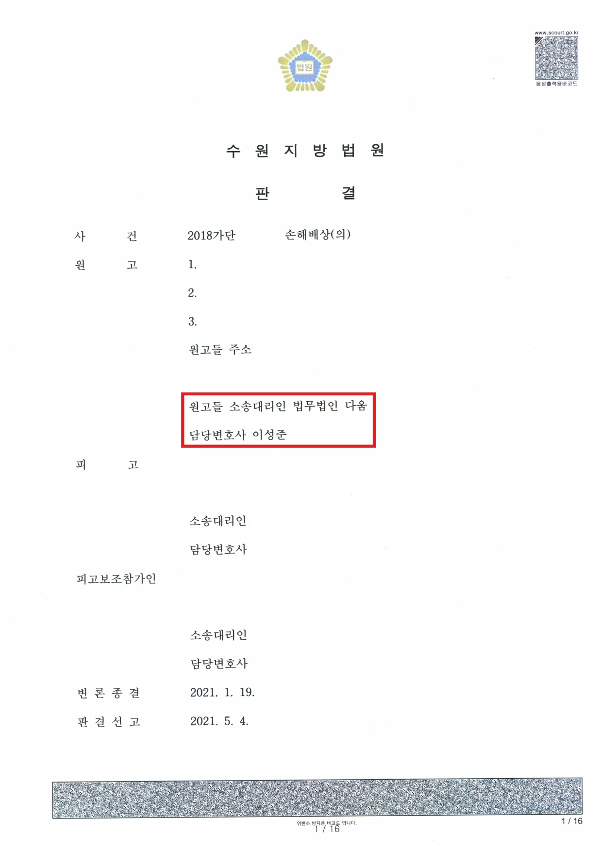 약 3년에 가까운 기간에 걸친 공방끝에 피고측의 의료상 과실(주의의무 위반)과 설명의무 위반으로 원고의 자기결정권을 침해한 데 따른 손해가 인정되어 원고승소 판결을 받아내었습니다.