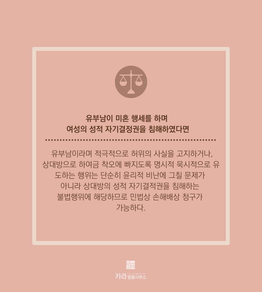 미혼임을 가장해 상대방의 성적 자기결정권을 침해해 성관계까지 가게 되었다면 이는 민사상 불법행위로 손해배상 청구가 가능한 사안이기 때문입니다.