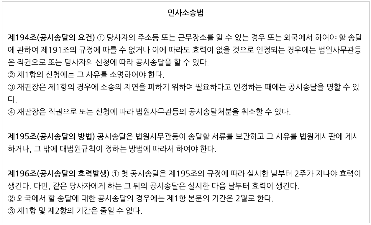 우리 의뢰인은 본인을 상대로 해서 소송이 제기되었다는 사실을 전혀 모르고 있었어요. 그런데 의뢰인이 가지고 온 판결문에는 우리 의뢰인의 이름이 선명하게 기입되어 있었어요. 이런 일이 가능한 걸까요??? 네!!! 가능해요!!! 우리 '민사소송법' 제194조는 '공시송달'에 관해 규정하고 있어요.