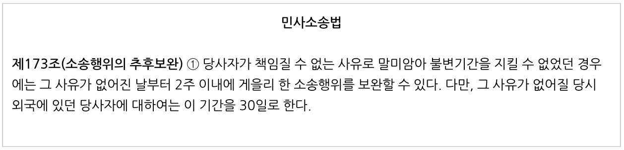 우리 민사소송법 제173조는 '당사자가 책임질 수 없는 사유로 말미암아 불변기간을 지킬 수 없었던 경우'에 그 행위를 보완할 수 있도록 규정하고 있어요. '불변기간'이라 함은 소송행위에서 변경하지 못하도록 법률로 정해 놓은 기간을 의미해요. 예를들어, 항소기간, 상고기간 등이 이에 해당하죠.