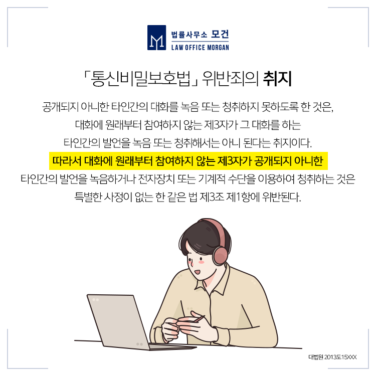특히 배우자나 연인 간의 부정행위의 증거수집을 위해 녹취를 활용하는 경우가 있는데, 이는 「통신비밀보호법」 위반으로 형사처벌의 대상이 됨은 물론, 별도의 민사상 위자료청구의 대상이 될 수도 있으므로 만약 그러한 혐의를 받고 계시다면 관련 사건에 경험이 많은 전문변호사의 도움을 받으셔야 합니다.