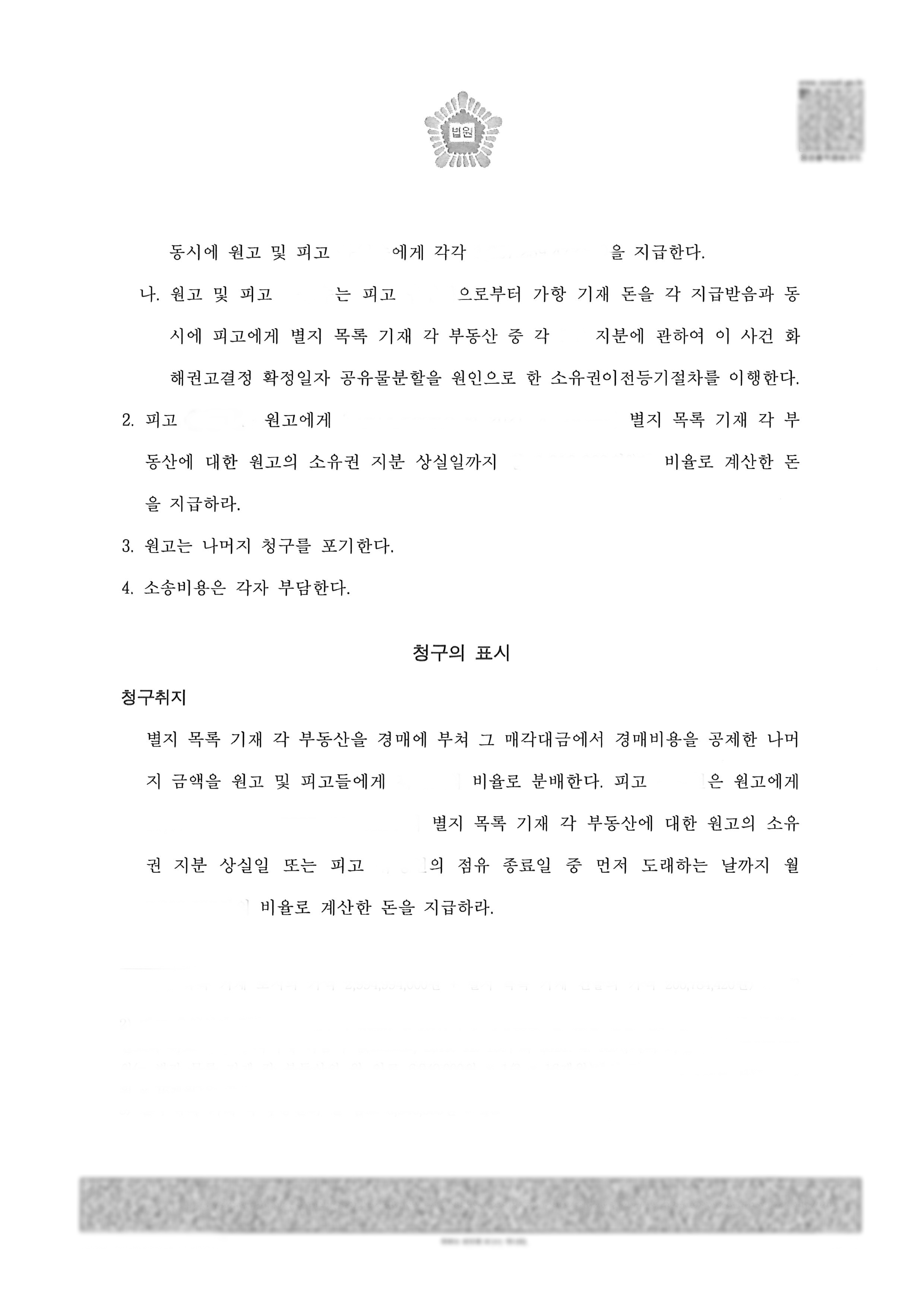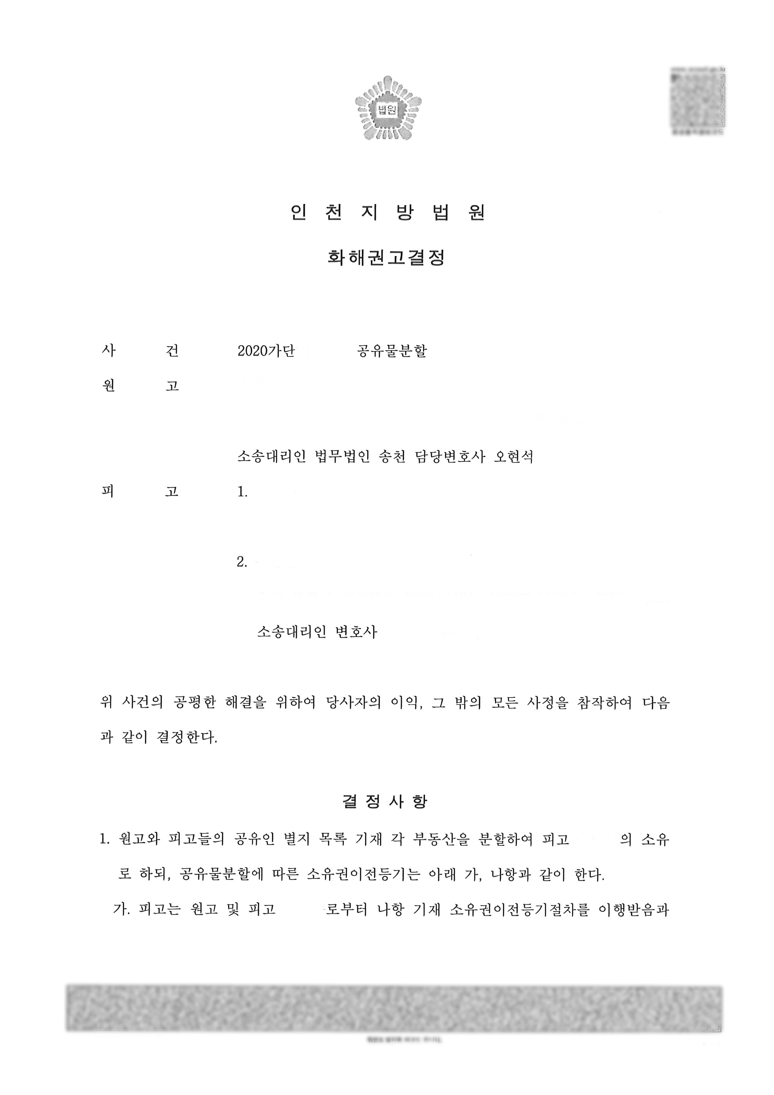 재판부와 원고 및 피고들이 해결방안에 대해 여러 차례 논의를 하게 되었고, 조정 과정을 한번 거쳐 협의를 하였지만 상호 양보할 수 없는 부분들이 있어 조정이 성립되지 않았습니다. 이후 소송과정에서 공유자 중 1인이 이 사건 부동산 전체를 점유하면서 사업체를 운영 중이므로 공유자 중 1인이 나머지 공유자들의 지분을 취득하되, 나머지 공유자들은 그 지분가액에 상응하는 가격을 보상받는 상식으로 이 사건 부동산을 분할하는 것이 합리적이라고 판단하고 공유자들을 충분히 설득하여 공유물을 이 사건 부동산을 점유하고 있는 공유자에게 전부 취득시키고 공유자 상호간의 지분 이전 의무 및 보상금 지급 의무는 동시이행하기로 하는 화해권고결정을 받을 수 있었습니다. 또한 감정평가를 통해 적정 임대료를 산출해서 이 사건 부동산을 점유하고 있는 공유자가 A에게 A의 소유권 지분 상실일까지 계산한 임대료를 지급하게 함으로써 승소와 다름 없는 소송 결과를 얻을 수 있었습니다.