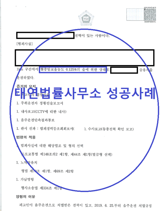 더불어 태연법률사무소에서는 다양한 형사사건 진행하고 있으며 다양한 음주운전 사건에서 우~수한 결과를 내고 있는만큼 이에 대한 결과를 소개해드리려고 합니다.