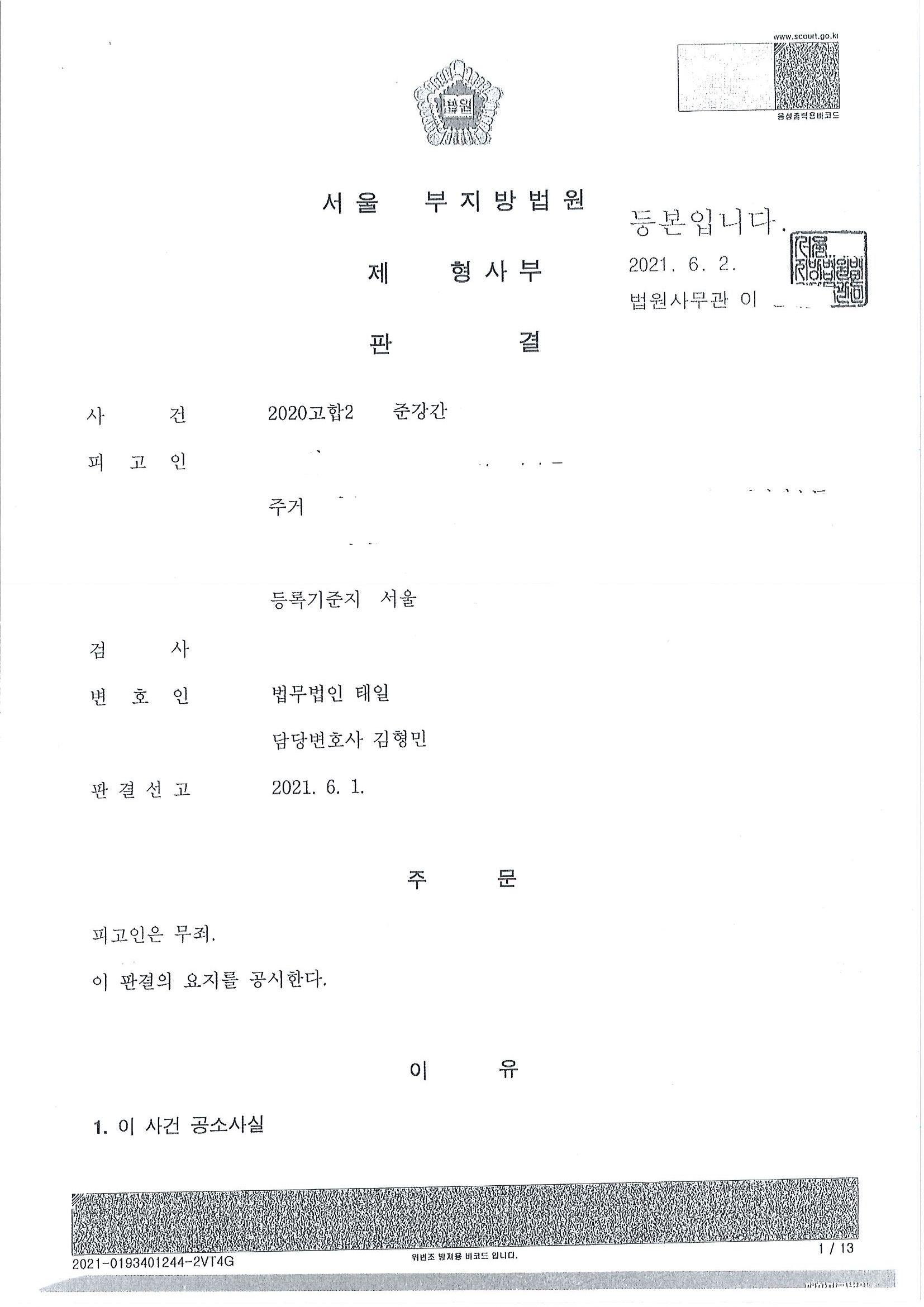 결과적으로는 수사단계의 허위진술을 바로잡고 이에 대한 합리적인 해명을 하는 등 많은 사정이 있었고 관련자들에 대한 증인신문을 거쳐 무죄판결을 받을 수 있었습니다. 판사님도 고심이 많았는지 판결문은 13쪽이나 되었습니다.