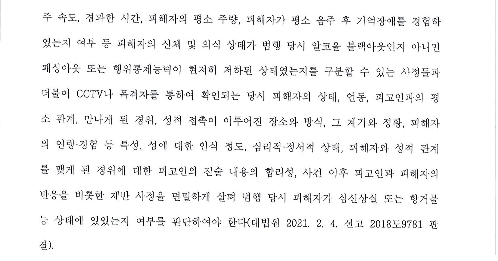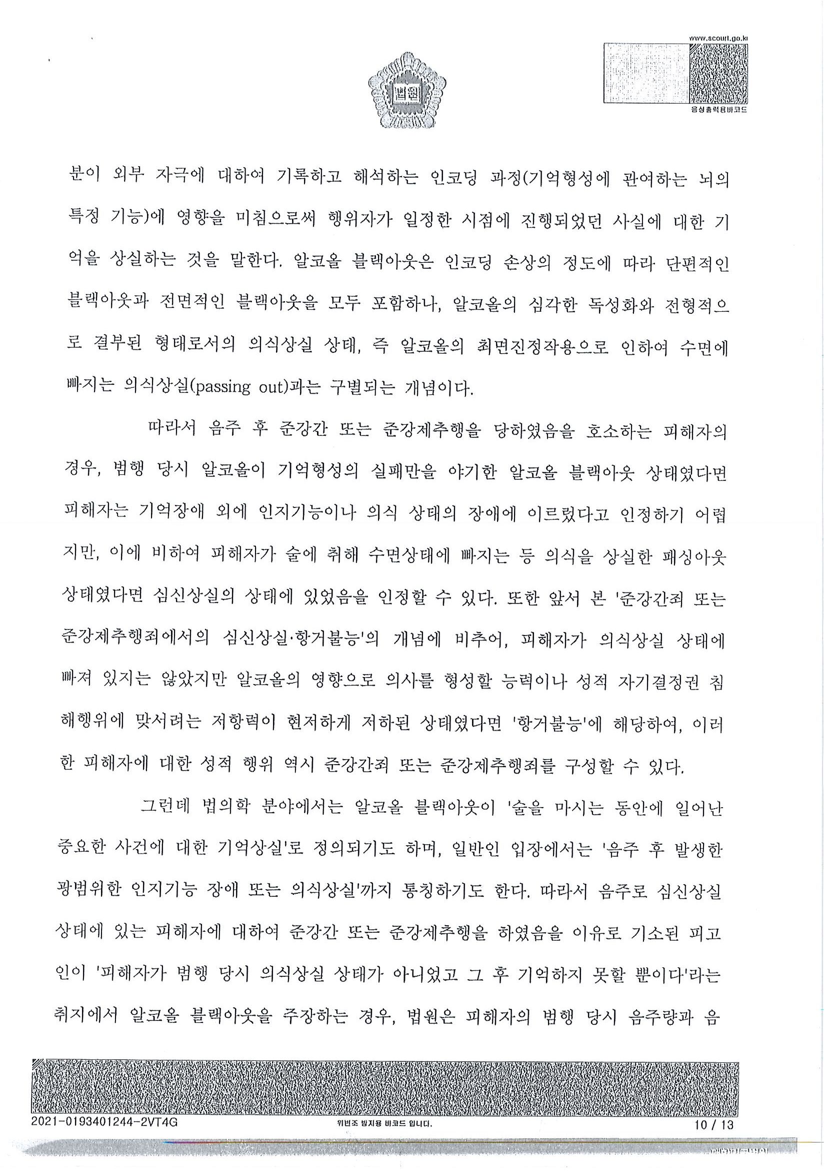 성범죄 사건이다보니 구체적인 내용을 다 소개할 수는 없으나 음주 상태에서의 이루어진 성관계에 대하여 준강간으로 수사받고 있는, 재판받고 있는 사람들에게, 또는 준강간으로 고소한 피해자분들에게 아래의 판례는 기준점이 될 것입니다.