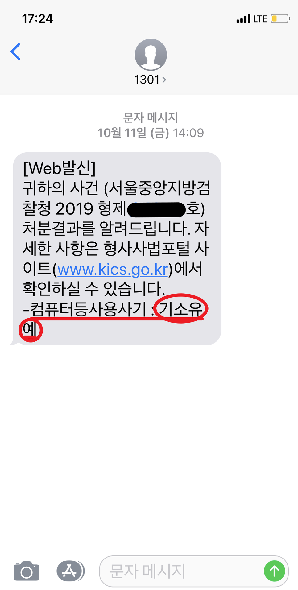 [본 사건에 대한 검찰 처분 결과 문자]