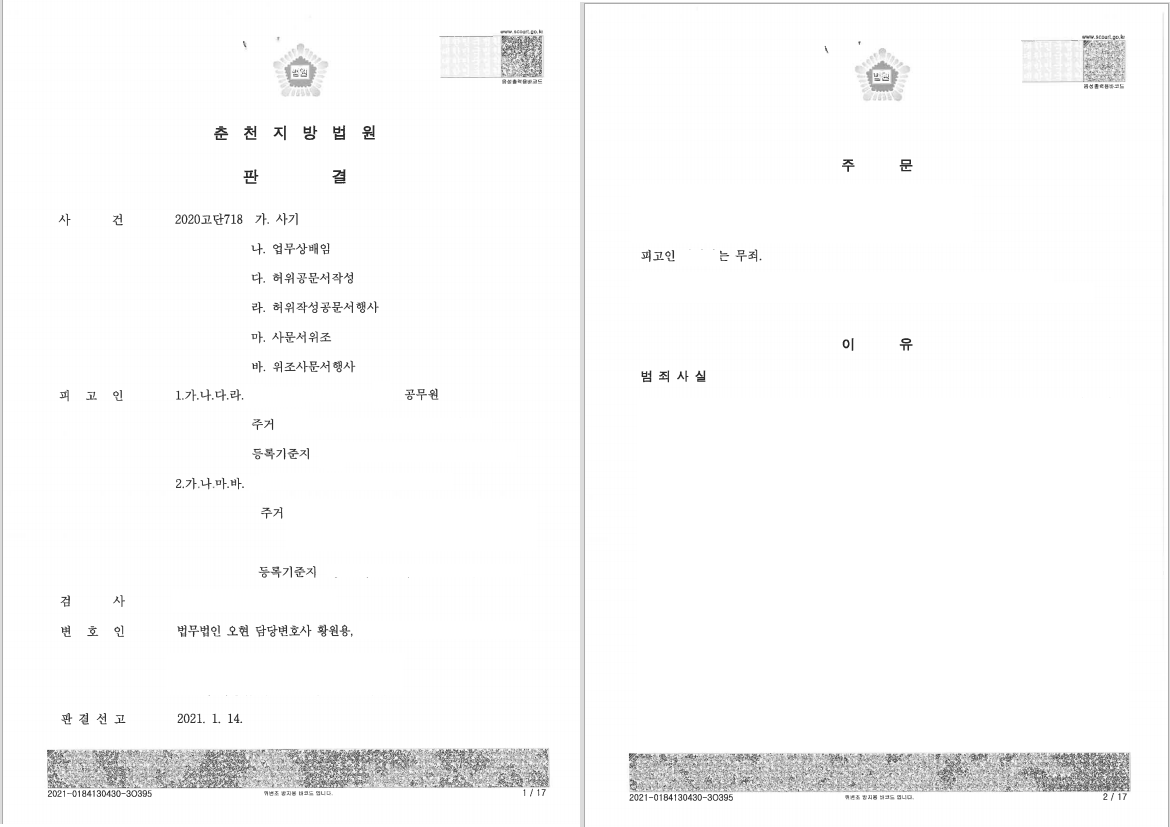 재판부는 본 변호인의 주장을 받아들여, 기소된 업무상 배임, 허위 공문서 작성 및 동행사 등 모든 범죄에 관하여 '무죄'를 선고하였고, 의뢰인은 공무원 지위를 유지하며 일상으로 돌아갈 수 있었습니다.