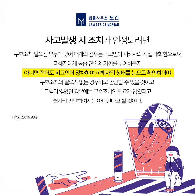 쉽게말해 운전 중 교통사고가 발생한 후, 사망이나 상해와 같은 인명 피해가 발생했음에도 불구하고 사고 운전자가 구호 조치 등을 취하지 않고 현장을 떠난 경우를 말합니다. 여기서 구호 조치란 사고 운전자가 피해자를 병원으로 이송하거나 구급차를 부르는 등의 조치를 뜻하며 피해자의 부상 정도가 가벼워 보여도 적극적인 구호활동을 필요로 합니다. 또한 사고 후 피해자에게 자신의 인적 사항(성명, 연락처, 주소)을 알려주지 않고 현장을 떠난 경우도 뺑소니에 해당되므로 주의하실 필요가 있습니다.