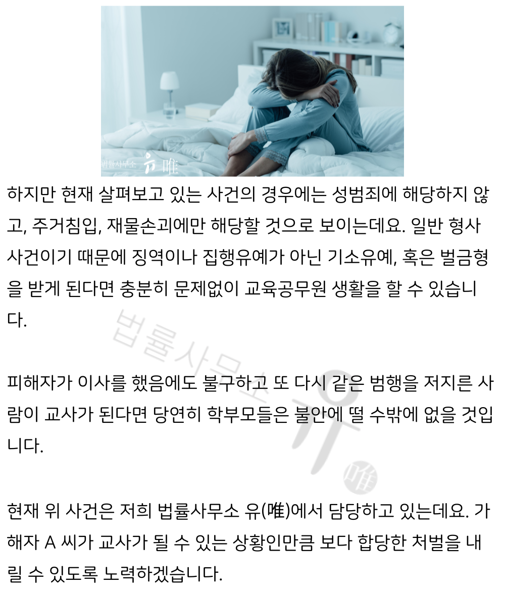 #주거침입죄 #성범죄 #교육공무원 #공무원결격사유 #형사전문변호사 #형사변호사 #수원형사전문변호사 #용인형사전문변호사 #인천형사전문변호사 #부천형사전문변호사 #서초형사전문변호사